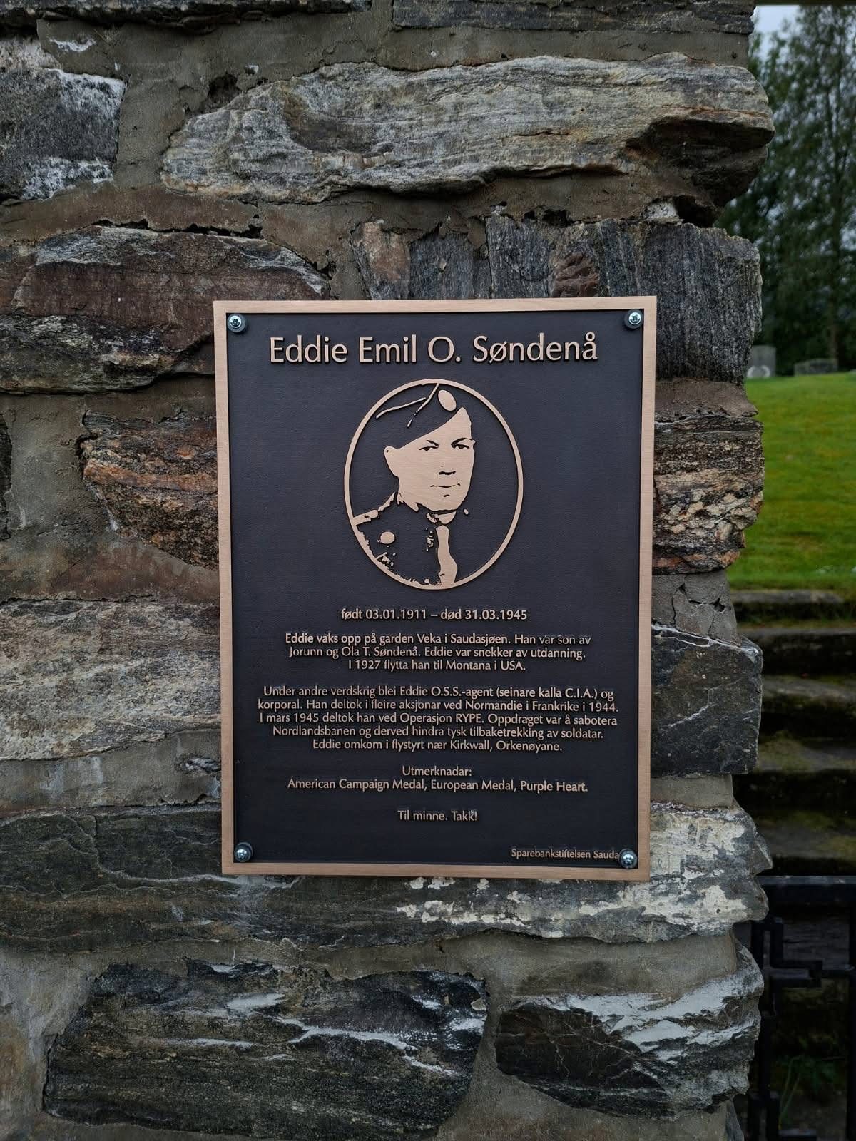 The plaque remembers the Norwegian-American OSS Soldier, Technical Sergeant Eddie Emil O. Sondena. T/SGT Sondena participated in OSS Operations in France (OSS Group Pat) and was part of Operation Rype, the blocking of German forces in Norway in 1945, when he was killed in a plane crash in Scotland while on the way to parachute at the target.