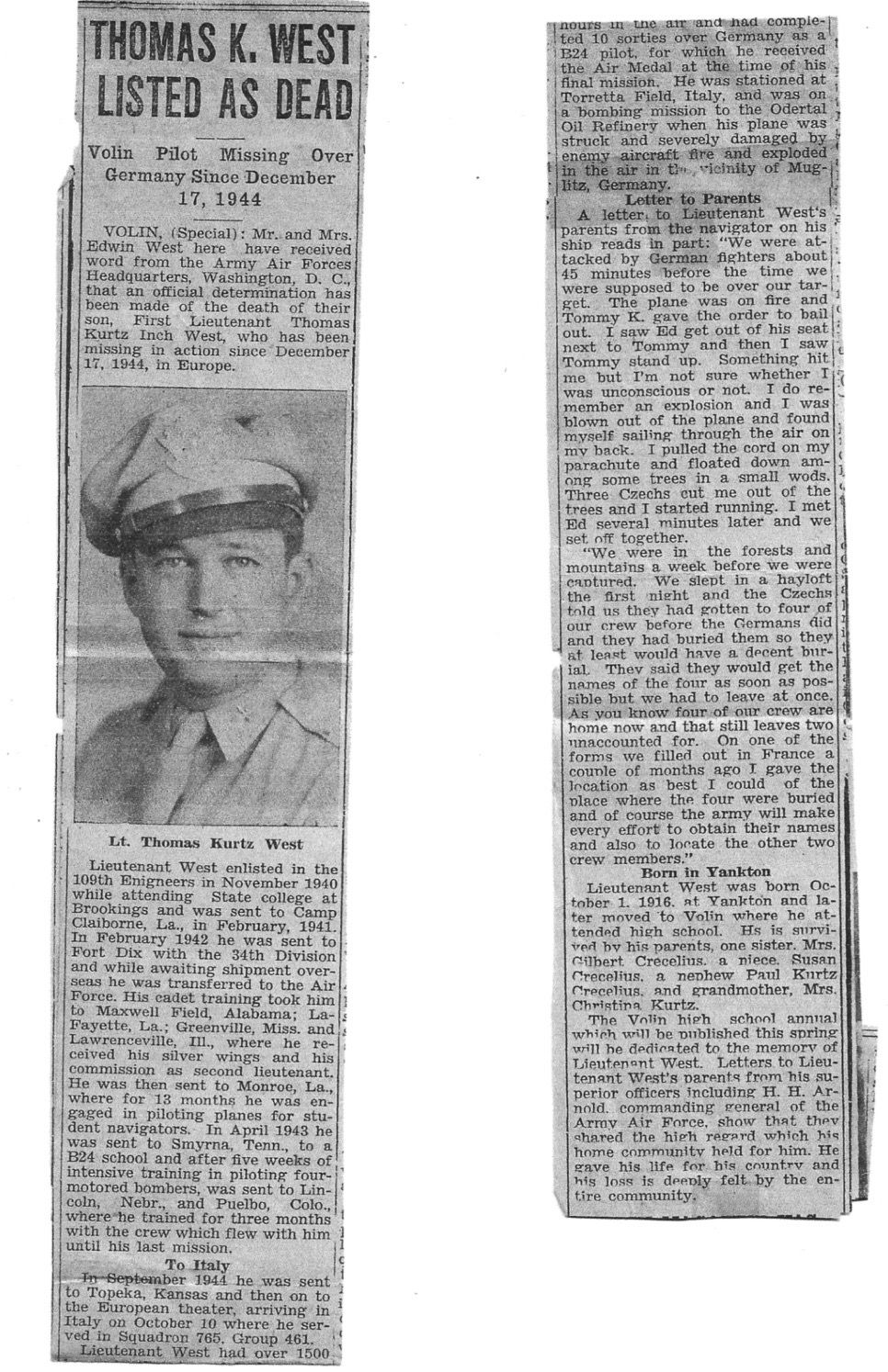 1LT Thomas Kurtz West was the Pilot on the the B-24 (44-41046) of the 765th Bomber Squadron, 461st Bomber Group (Heavy). They were shot down after a mission to Odertal Oil Rifinery in Germany on Dec 17, 1944. Six of the crew were killed in the plane crash; 4 survived. The grave site remembers the six who perished in the crash. The grave originally included the bodies of five crew members, but two were repatriated in the early 1950s.