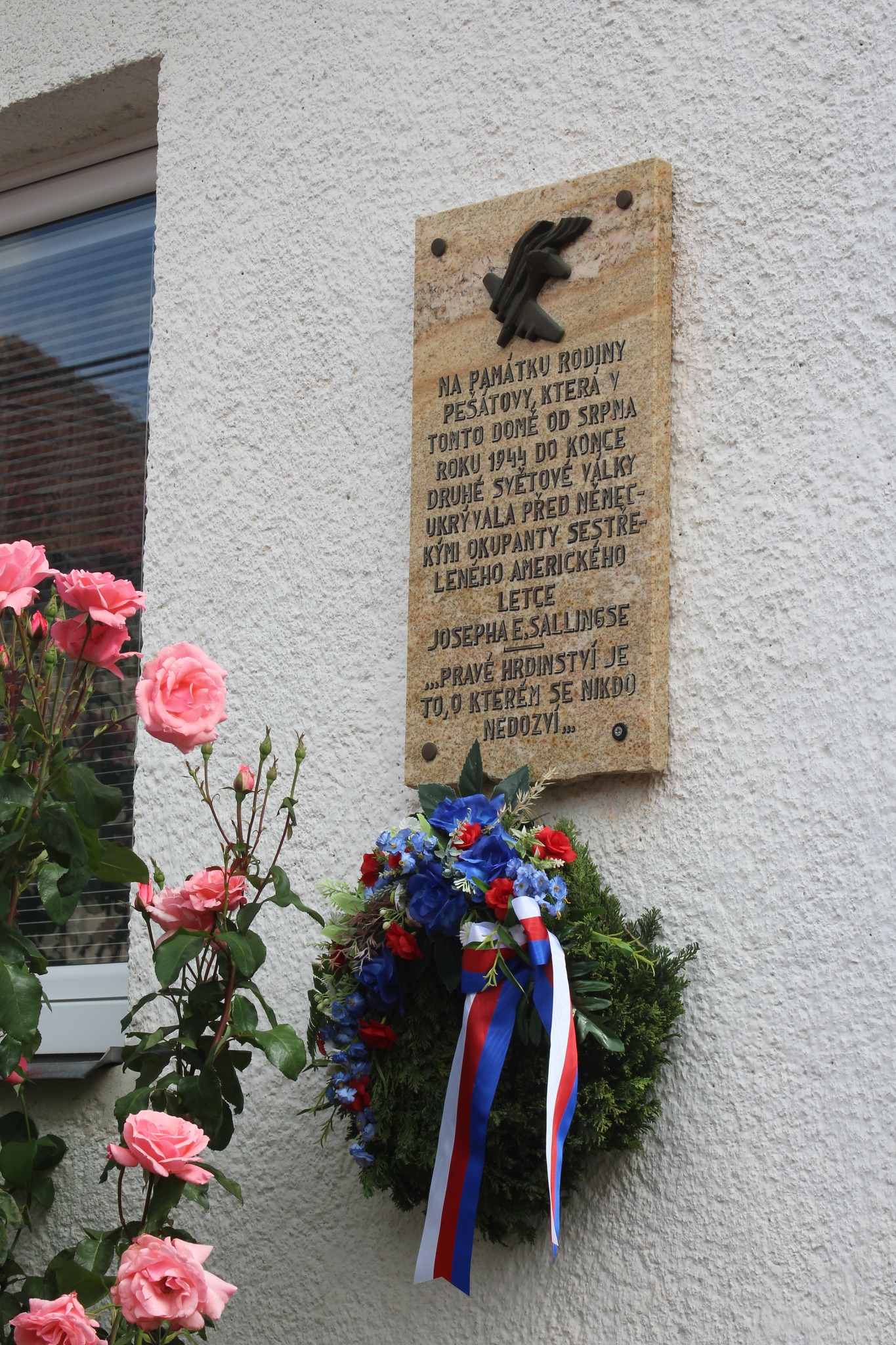 IN MEMORY OF THE PEÁTOV FAMILY, WHO HID THE AMERICAN AIRMAN JOSEPH E. SALLINGS FROM THE GERMAN OCCUPANTS IN THIS HOUSE FROM AUGUST 1944 UNTIL THE END OF THE SECOND WORLD WAR...TRUE HEROISM IS THAT WHICH NO ONE KNOWS ABOUT...