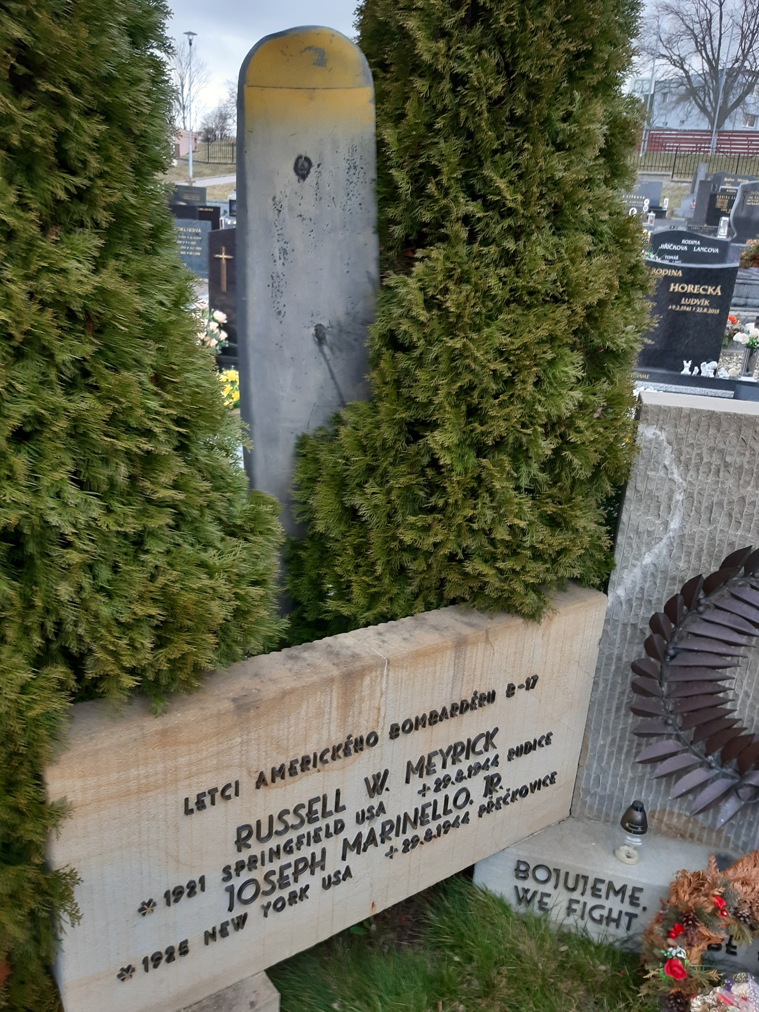 Note: Next to the cenotaph of the two US Airmen, are the graves of two Czech Freedom fighters Frantiek Kobzík and Josef Vanc. These two Czechs were trained in Britain and deployed to Czechoslovakia as part of the SOE "Operation Carbon". They were killed in Rudice in May 1944. Frantiek Kobzík was an Olympic Rower for Czechoslovakia in the 1936 Olympics in Berlin.