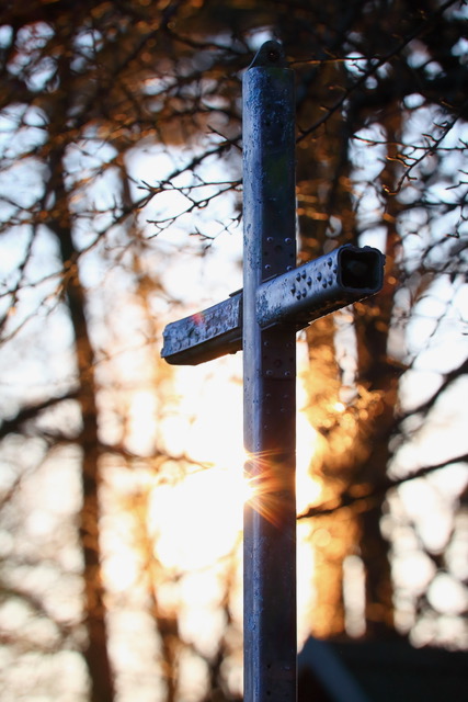 MonumentA large field stone with a cross and an engraved stainless steel plaque attached to the front.