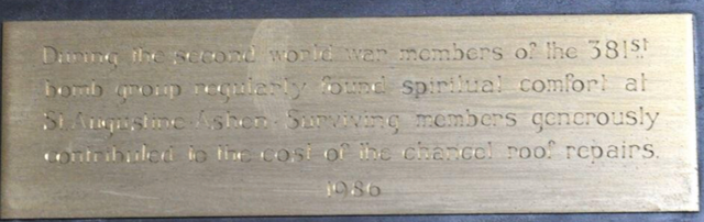 The plaque remembers the 381st Bomber Group that flew from nearby RAF Ridgewell (USAAF Station 167) during WW2.