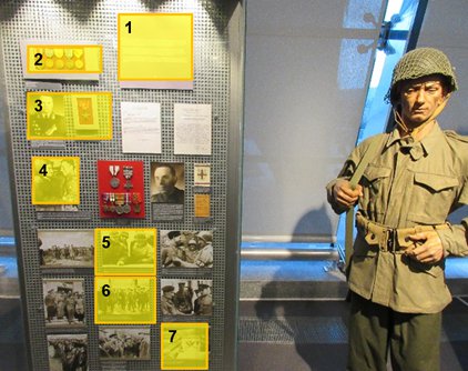 Commemorative ObjectIn the center of the hall, mannequins dressed in Soviet, British, U.S., and Free French World War II uniforms stand as symbols of unity among the Allied nations. Surrounding them are display cases filled with photographs and authentic military artifacts, illustrating the combined efforts of the United States, Soviet Union, United Kingdom, Poland, and France in the fight against Nazi Germany. Among the exhibits is a World War IIera U.S. Army infantry captains uniform shirt bearing the 69th Infantry Division patch, displayed with an M1 Garand rifle, bayonet, ammunition pouches, canteen, and entrenching tool items representing the bravery and discipline of the American soldier.