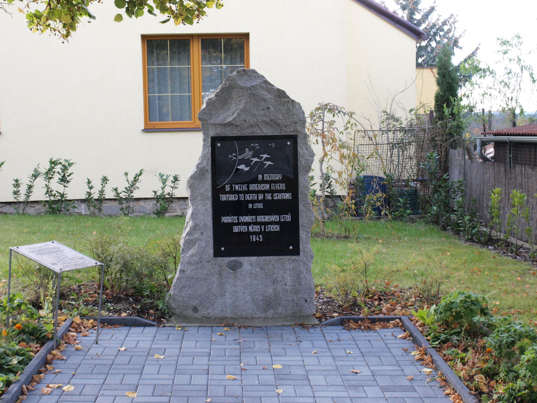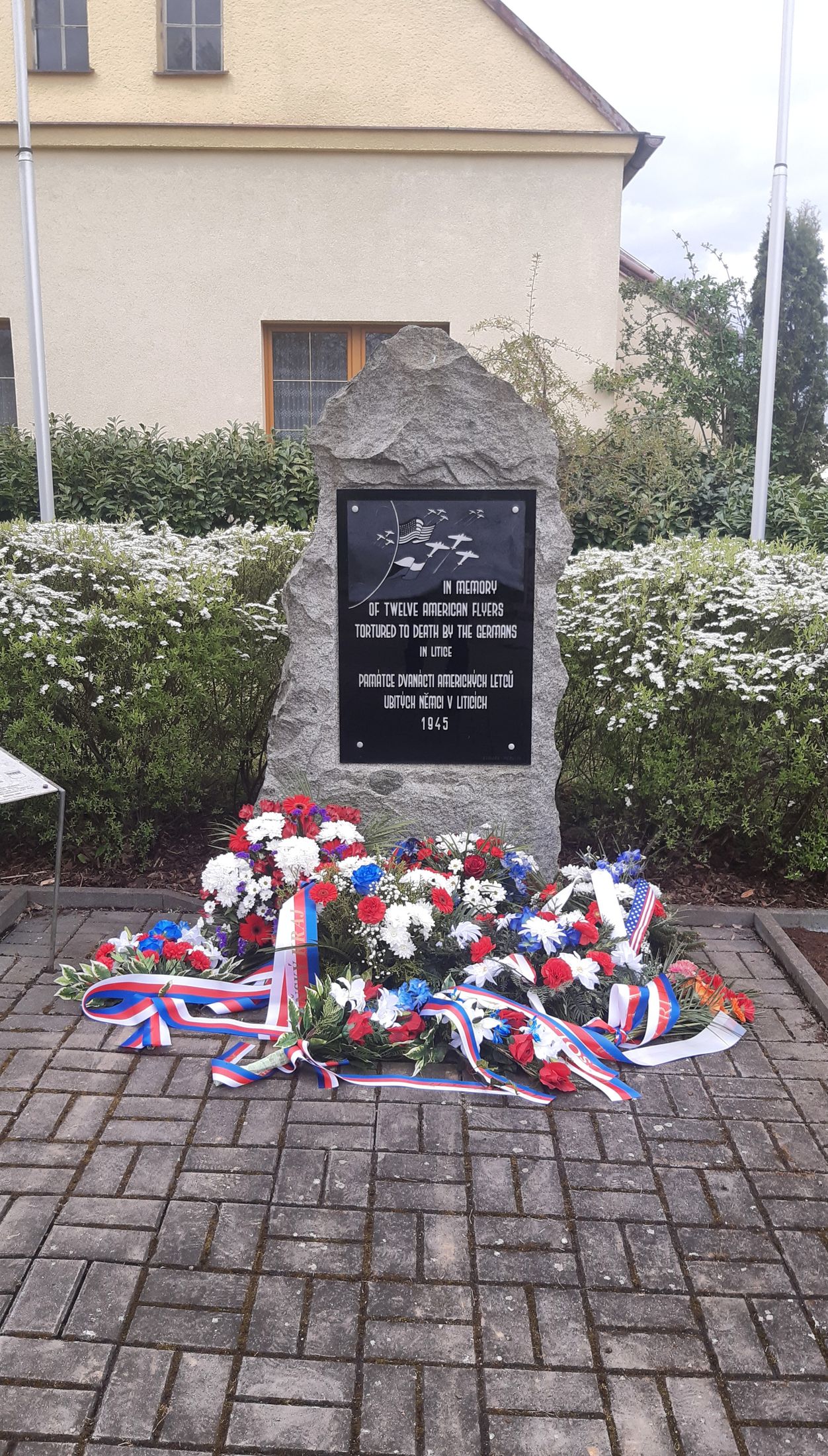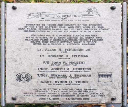 The memorial remembers 12 American airmen executed by the enemy. It is unclear who these 12 were. The side plaque remembers the B-17 (42-97266) 'Godfathers inc.' of the 602nd Bomber Squadron, 398th Bomber Group that the memorial claims was the last bomber of the 8th US Air Force shot down during WW2 during a mission to bomb the Skoda armament works in Pilsen, then Czechoslovakia; six of the eight crew were killed in action. The 398th Bomber Group Association newsletter provides some background on this last mission (below). The other plane shot down on his mission was the B-17 (43-38652) 'Stinker Jr'; one of the crew, S/SGT Charles B. Walker was killed in action, the remaining crew survived.