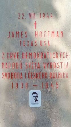 The memorial remembers 1LT James Hoffman of the 2nd Fighter Squadron, 52nd Fighter Group, flying P-51 (44-13431) out of Madna, Italy, who was shot down on August 22, 194,4, while escorting bombers on a mission to Blechhammer Oil Refinery (in what is now Blachownia lska, Poland). Upon returning from the mission, it is unclear what caused the crash. 1LT Hoffman was buried nearby in Kromeriz and, in the late 1940s, repatriated to his hometown of Harrisburg for burial.
