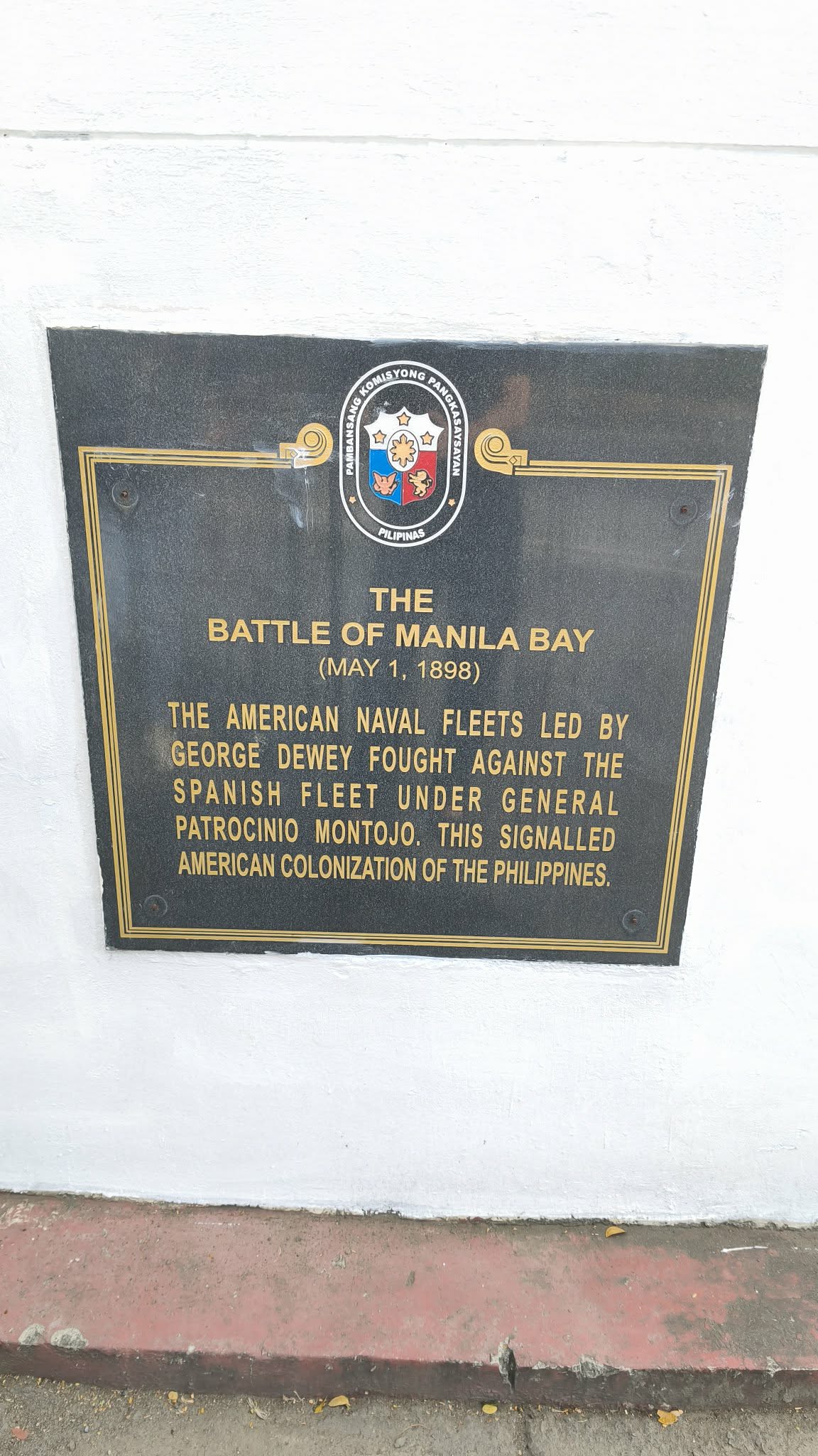 MonumentA freestanding sculptural monument stands on a raised concrete pedestal, featuring at its summit a life-sized statue of a uniformed male figure wearing a cap and jacket and holding binoculars. Set into the pedestal below is a rectangular plaque bearing the seal of the National Historical Commission of the Philippines, featuring a brief historical account of the naval engagement between the American fleet and the Spanish fleet, an event that marked the beginning of American colonization of the Philippines.