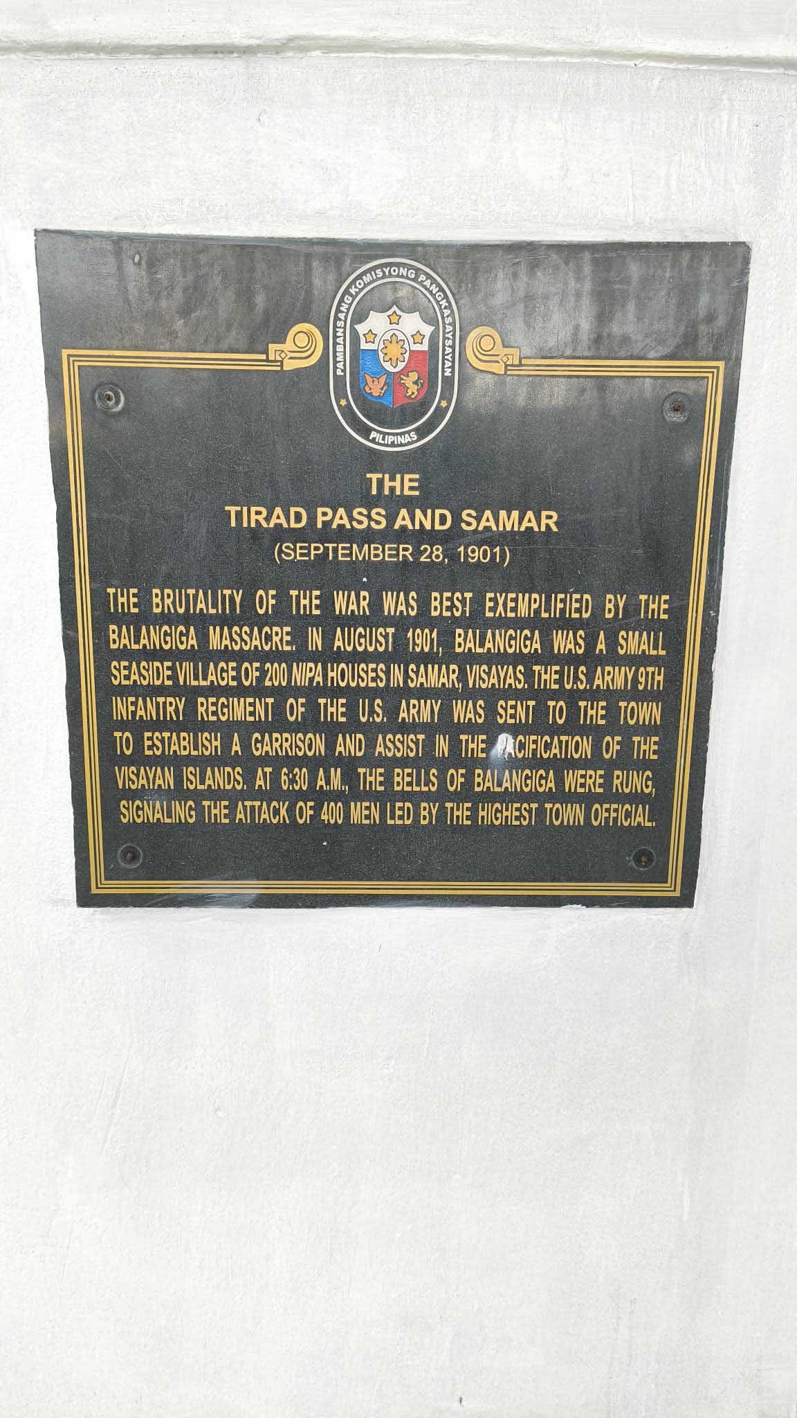 MonumentThe monument features a life-sized statue of a Filipino revolutionary, shown barefoot and clad in modest period attire. One arm is raised high, holding a bolo or spear, while the other grips a bladed weapon, a pose that evokes defiance, resistance, and preparedness for combat. Embedded in the front of the pedestal below is a rectangular plaque bearing the seal of the National Historical Commission of the Philippines, which recounts the brutality of the Balangiga Massacre and the subsequent retaliatory actions carried out by U.S. forces during the PhilippineAmerican War, emphasizing Samars devastation and its description as a howling wilderness.