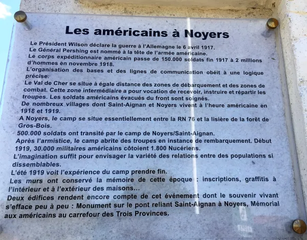 The memorial remembers the many thousands of Americans stationed here and who passed through this area from 1917 to 1919 during World War 1. Noyons-sur-Cher series of bases was part of the American Expeditionary Forces (AEF) Services and Supply Intermediate Zone logistics effort.