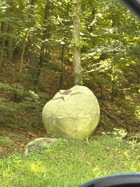 A concrete boulder, 1 meter in diameter, with a five pointed star in relief.