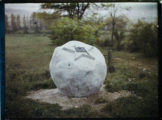 One of 23 such boulders marking significant sites for the 2nd Infantry division in WWI. This marker commemorates the 5th Marines crossing the Meuse about 2 km south of here on the night of 10-11 November 1918, moving downstream (north) using the river bank for cover, and then taking Belle Fontaine Ferme (shown in the middle of the image) on the morning of the 11th. Immediately off to the left of the image is Warmonterme Ferme and la Scierie Ferme. The Marines referred to this group of three adjacent farms as a small village. The Germans were deployed in the ditches along the D964 and in the woods at the top of the ridge to the east.