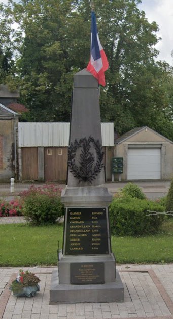 A vertical stone pillar with four French flags on top, commemorating the town's war dead and an American aviator on a plaque at the bottom of the monument.