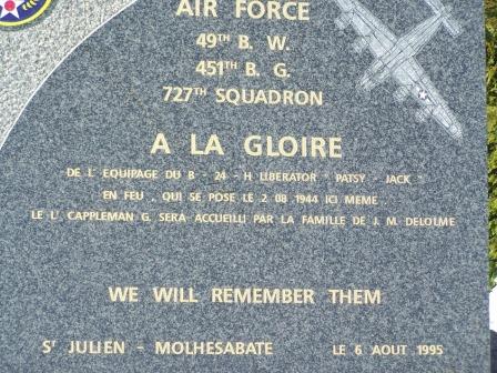 sera acceuilli par la famille de J.M Delolme. Le 6 Aout 1995 = To the glory of the crew of the B-24H Liberator