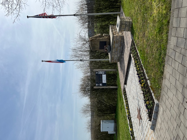 This monument is located directly off the road in an open area, directly between two flag poles.