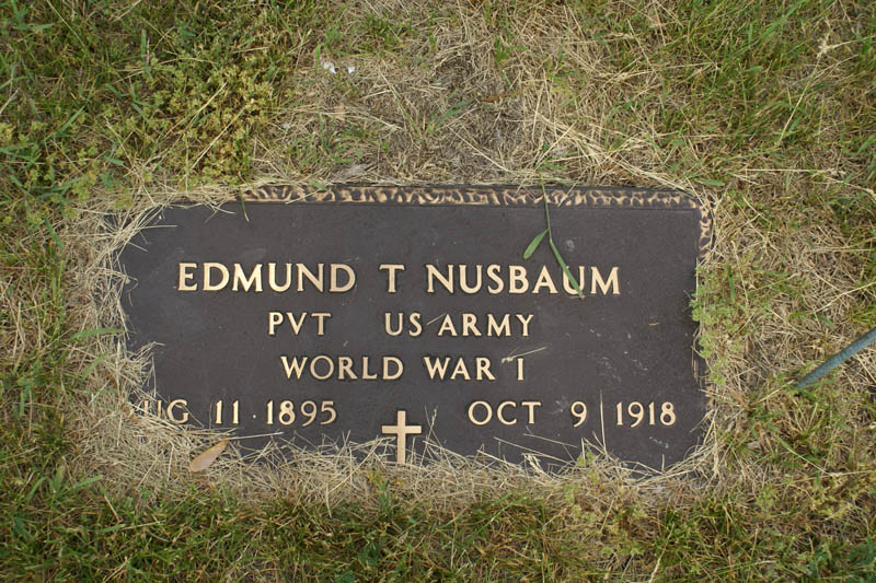 When Edmund Thibertus Nusbaum was born on August 11, 1895, in Michigan, his father, John, was 33 and his mother, Therasa, was 32. He had four brothers and three sisters. He served in the U.S. Army during World War I as a Private in Company A, 16th Infantry Regiment, 1st Infantry Division. He was Killed in Action on October 9, 1918 (at the age of 23) and is now buried in Saint Anthony's Cemetery, Monroe County, Michigan, USA.