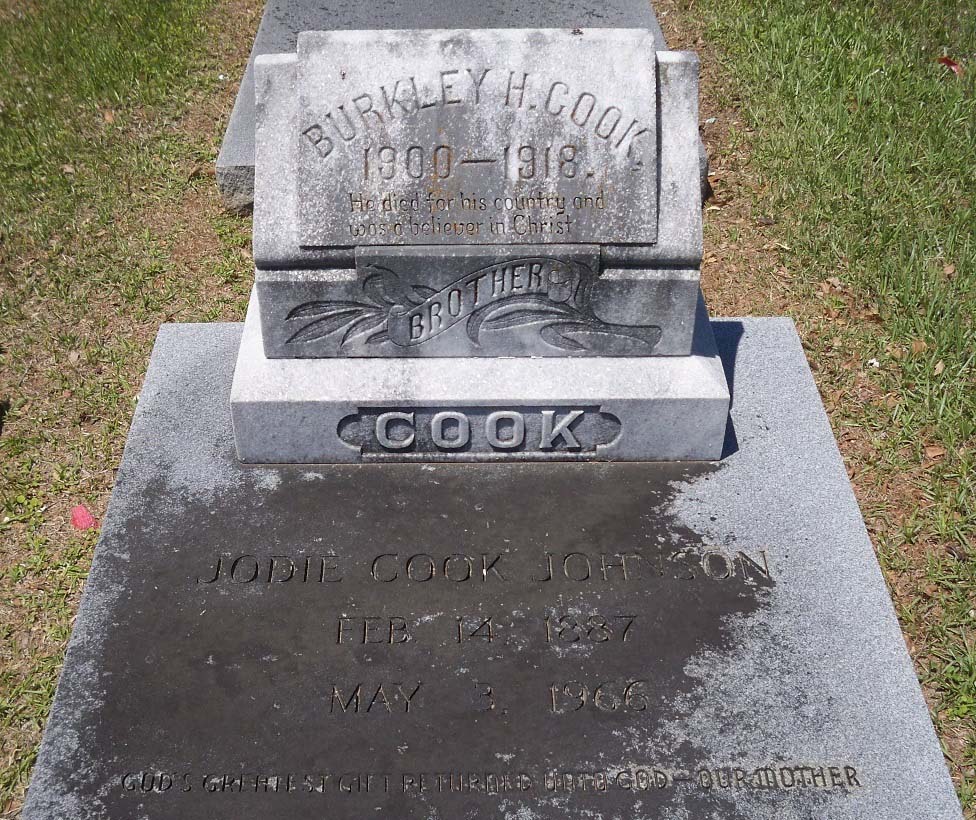 Burkley H. Cook was born in 1900. He served in the U.S. Army during World War I as a Corporal in Company C, 16th Infantry Regiment, 1st Infantry Division. He was Killed in Action in 1918 and is now buried in Oakwood Cemetery, Montgomery, Montgomery County, Alabama, USA.