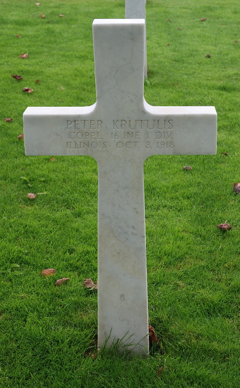 Peter Krutulis entered the military service in Illinois. He served in the U.S. Army during World War I as a Corporal in Company C, 16th Infantry Regiment, 1st Infantry Division. He was Killed in Action on October 8, 1918 and is now buried in Meuse-Argonne American Cemetery and Memorial, Romagne-sous-Montfaucon, Departement de la Meuse, Lorraine, France.