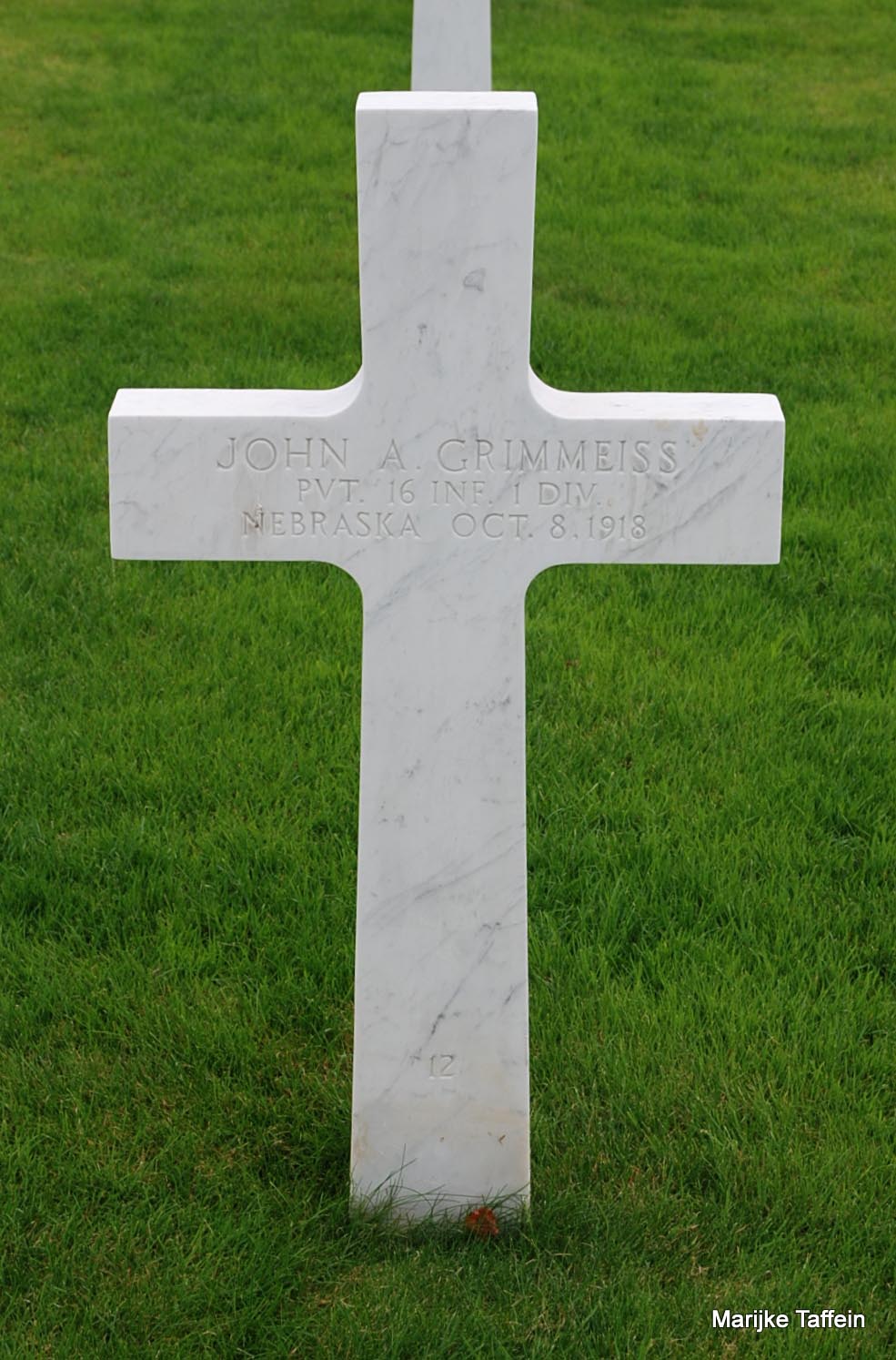 John A. Grimmeiss entered the military service in Nebraska. He served in the U.S. Army during World War I as a Private in Company C, 16th Infantry Regiment, 1st Infantry Division. He was Killed in Action on October 8, 1918 and is now buried in Meuse-Argonne American Cemetery and Memorial, Romagne-sous-Montfaucon, Departement de la Meuse, Lorraine, France.