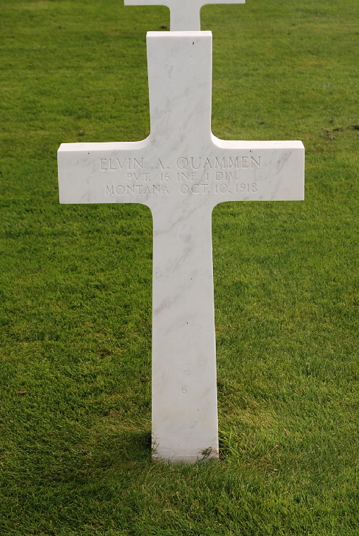 Elvin A. Quammen entered the military service in Montana. He served in the U.S. Army during World War I as a Corporal in Company D, 16th Infantry Regiment, 1st Infantry Division. He died from his wounds received in battle on October 10, 1918 and is now buried in Meuse-Argonne American Cemetery and Memorial, Romagne-sous-Montfaucon, Departement de la Meuse, Lorraine, France.