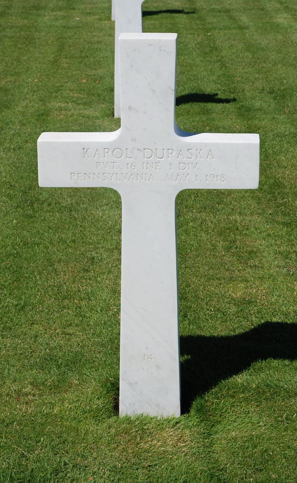 Karol Duraska was born on December 17, 1895 in Slovakia. He entered the military service in Pennsylvania and served in the U.S. Army during World War I as a Private in Company D, 16th Infantry Regiment, 1st Infantry Division. He was Killed in Action on May 1, 1918 and is now buried in Somme American Cemetery, Bony, France.