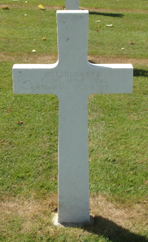 Dee Bennett entered the military service in Arkansas. He served in the U.S. Army during World War I as a Corporal in Company E, 16th Infantry Regiment, 1st Infantry Division. He died on October 5, 1918 and is now buried in Meuse-Argonne American Cemetery and Memorial, Romagne-sous-Montfaucon, Departement de la Meuse, Lorraine, France.