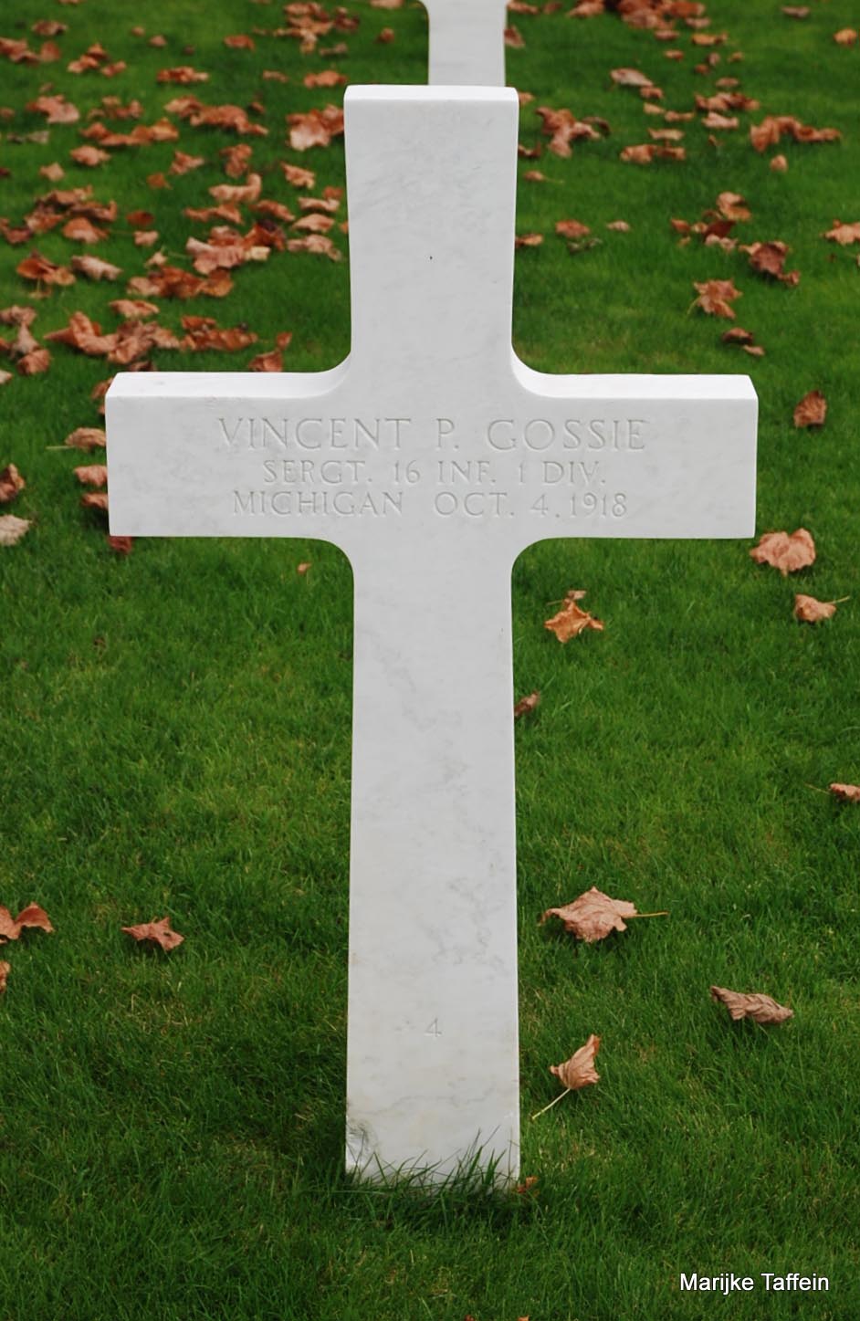 When Vincent P. Gossie was born on July 28, 1894, in Wayne, Michigan, his father, Anthony, was 28 and his mother, Isabella, was 34. He had two sisters. He served in the U.S. Army during World War I as a Sergeant in Company E, 16th Infantry Regiment, 1st Infantry Division. He was Killed in Action on October 4, 1918 and is now buried in Meuse-Argonne American Cemetery and Memorial, Romagne-sous-Montfaucon, Departement de la Meuse, Lorraine, France. His name is commemorated on the First Infantry Division monument in Saint-Juvin, France but his surname is inscribed as Goosie and ranked as a Private.