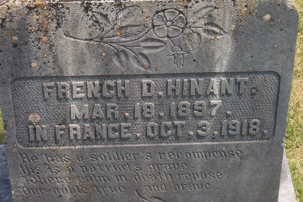 When French D. Hinant was born on March 18, 1897, in Kentucky, his father, Montezuma, was 51 and his mother, Florence, was 28. He had three brothers and two sisters. He served in the U.S. Army during World War I as a Private First Class in Company I, 16th Infantry Regiment, 1st Infantry Division. He was Killed in Action on October 3, 1918 (at the age of 21) in France and is now buried in Cook Cemetery, Woodbury, Butler County, Kentucky, USA.