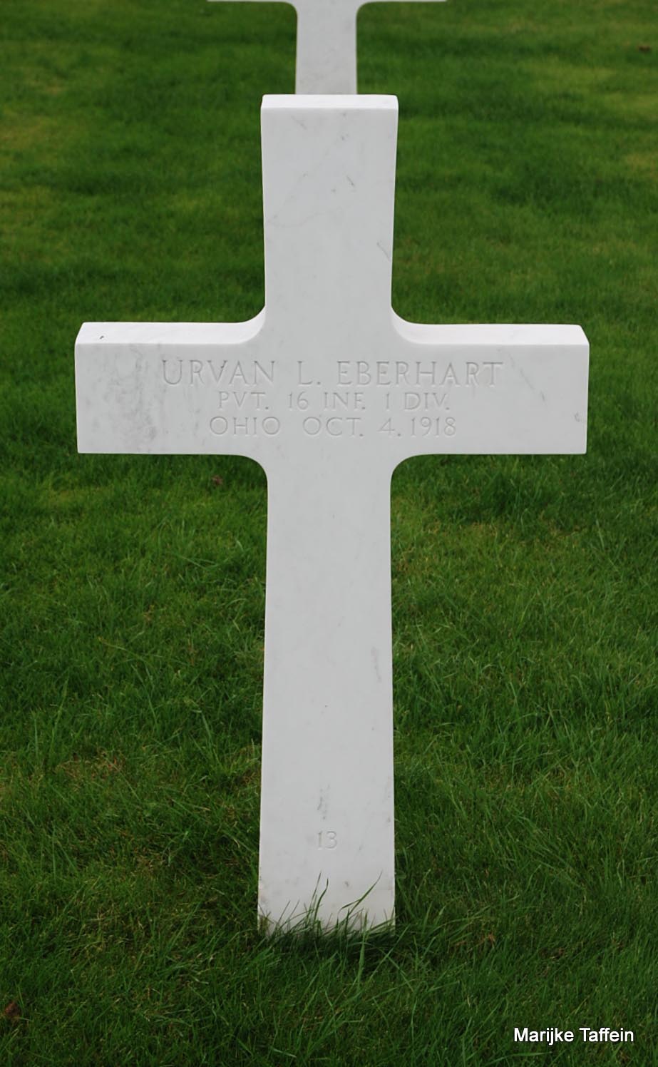 Urvan L. Eberhart entered the military service in Ohio. He served in the U.S. Army during World War I as a Private in Company I, 16th Infantry Regiment, 1st Infantry Division. He was Killed in Action on October 4, 1918 and is now buried in Meuse-Argonne American Cemetery and Memorial, Romagne-sous-Montfaucon, Departement de la Meuse, Lorraine, France.