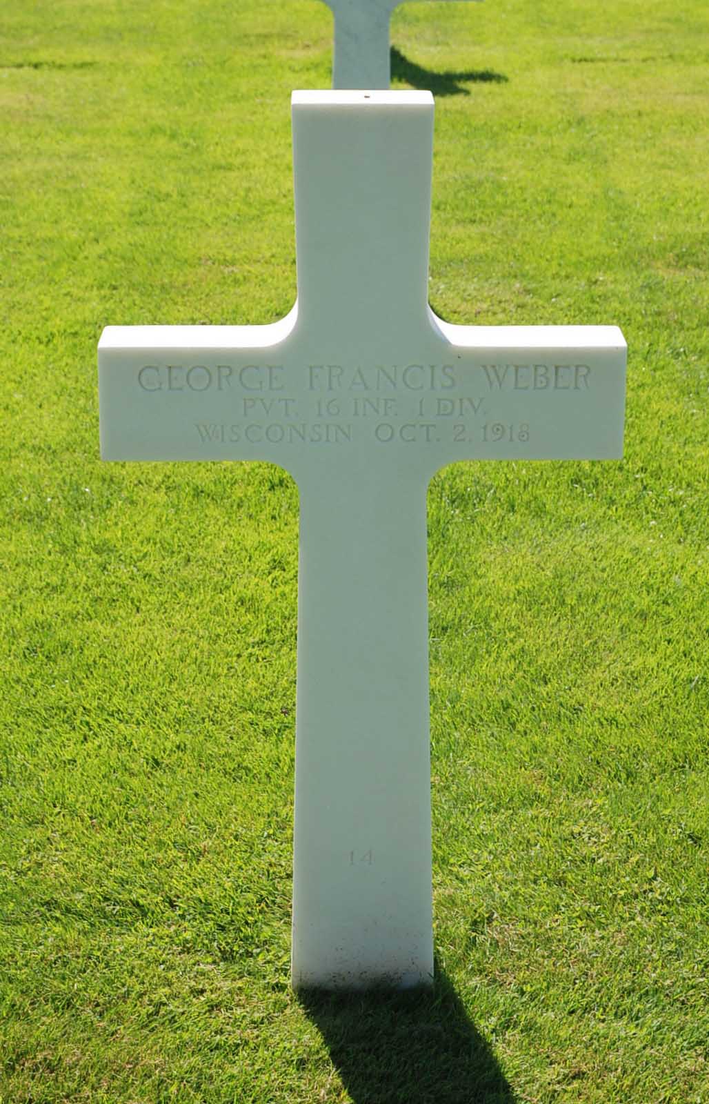 George F. Weber entered the military service in Wisconsin. He served in the U.S. Army during World War I as a Private in Company I, 16th Infantry Regiment, 1st Infantry Division. He died from his wounds received in battle on October 2, 1918 and is now buried in Meuse-Argonne American Cemetery and Memorial, Romagne-sous-Montfaucon, Departement de la Meuse, Lorraine, France.