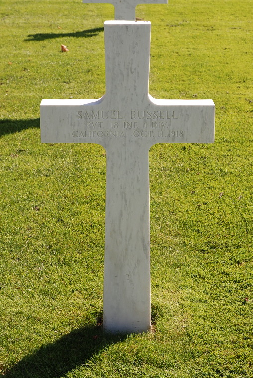Samuel Russell entered the military service in California. He served in the U.S. Army during World War I as a Private in Company A, 18th Infantry Regiment, 1st Infantry Division. In the Meuse-Argonne offensive on October 11, 1918, while going forward alone to attack a machine gun nest which had cut off his retreat, Russell and his companions had launched an attack of the nest, which was holding up the advance of Company A. Russell's companions were all killed or wounded, and the fire from the guns had cut off all retreat. Russell made the charge alone, using a French Chauchat automatic rifle as his weapon. He succedded in silencing two of the guns, but was killed by one of the enemy before he could take them prisoners. He is now buried in Meuse-Argonne American Cemetery and Memorial, Romagne-sous-Montfaucon, Departement de la Meuse, Lorraine, France. His name is commemorated on the First Infantry Division monument in Saint-Juvin, France and ranked as a Private First Class.