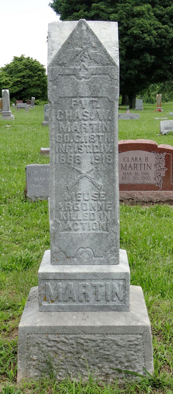 When Charles William Martin was born on March 6, 1888, in Illinois, his father, Stephen, was 29 and his mother, Mahala, was 28. He served in the U.S. Army during World War I as a Private in Company C, 18th Infantry Regiment, 1st Infantry Division. He was Killed in Action on October 6, 1918 and is now buried in Mount Gilead Cemetery, Carrollton, Greene County, Illinois, USA.