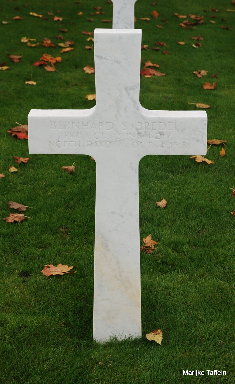 Bernhard S. Bredell entered the military service in North Dakota. He served in the U.S. Army during World War I as a Private in Company D, 18th Infantry Regiment, 1st Infantry Division. He was Killed in Action on October 4, 1918 and is now buried in Meuse-Argonne American Cemetery and Memorial, Romagne-sous-Montfaucon, Departement de la Meuse, Lorraine, France.