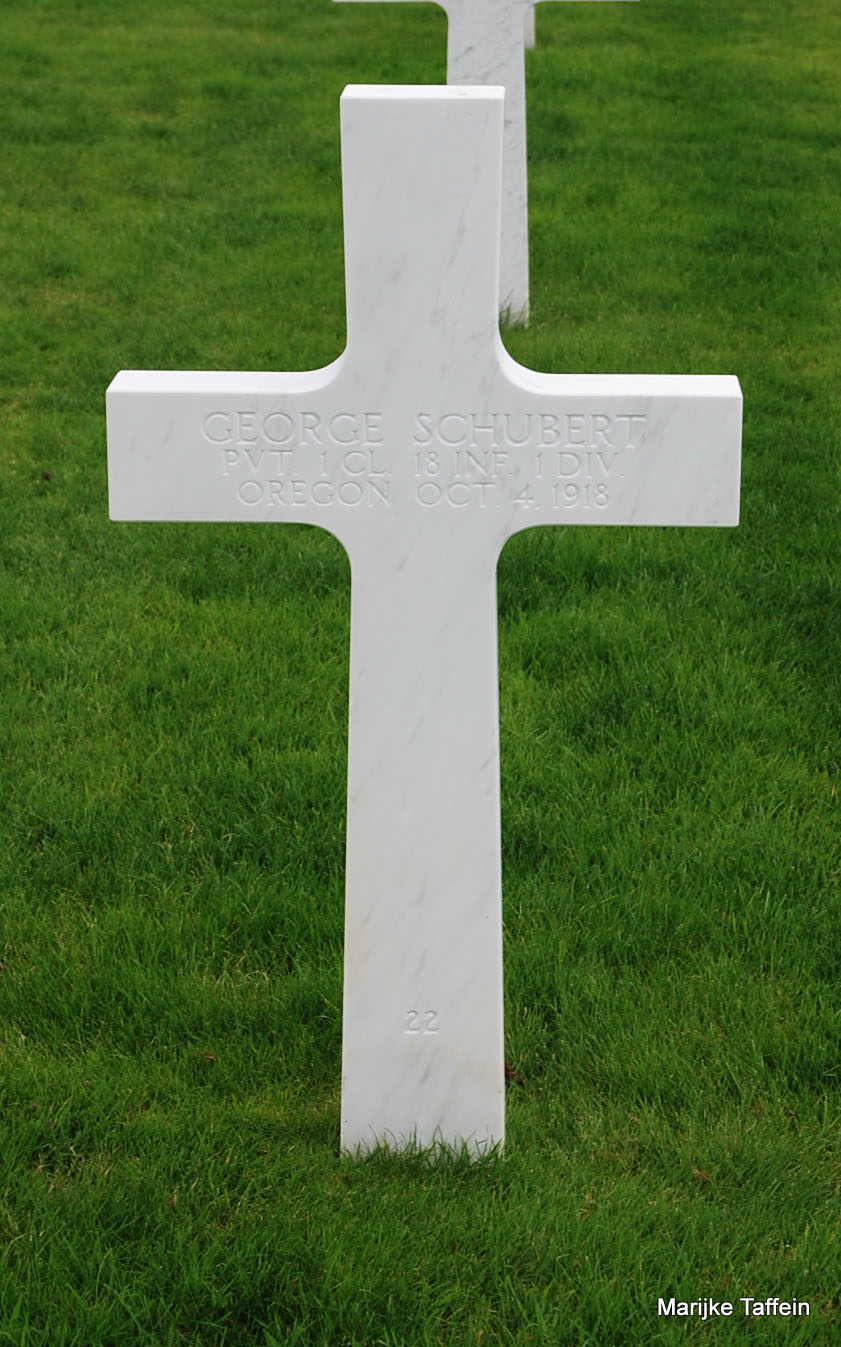 George Schubert entered the military service in Oregon. He served in the U.S. Army during World War I as a Private First Class in Company D, 18th Infantry Regiment, 1st Infantry Division. He was Killed in Action on October 4, 1918 and is now buried in Meuse-Argonne American Cemetery and Memorial, Romagne-sous-Montfaucon, Departement de la Meuse, Lorraine, France. His name is commemorated on the First Infantry Division monument in Saint-Juvin, France and ranked as a Private.