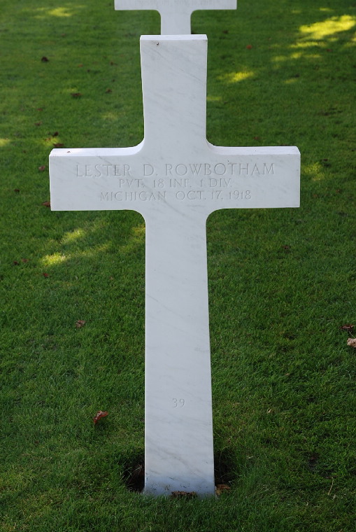 When Lester D. Rowbotham was born on September 22, 1891, in Bad Axe, Michigan, his father, Edward, was 59 and his mother, Matilda, was 46. He married Mary Alice Schad on November 24, 1913, in his hometown. He served in the U.S. Army during World War I as a Private in Company E, 18th Infantry Regiment, 1st Infantry Division. He was Killed in Action on October 17, 1918 and is now buried in Meuse-Argonne American Cemetery and Memorial, Romagne-sous-Montfaucon, Departement de la Meuse, Lorraine, France.