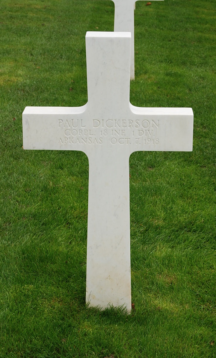 Paul Dickerson entered the military service in Arkansas. He served in the U.S. Army during World War I as a Corporal in Company G, 18th Infantry Regiment, 1st Infantry Division. He was Killed in Action on October 7, 1918 and is now buried in Meuse-Argonne American Cemetery and Memorial, Romagne-sous-Montfaucon, Departement de la Meuse, Lorraine, France.