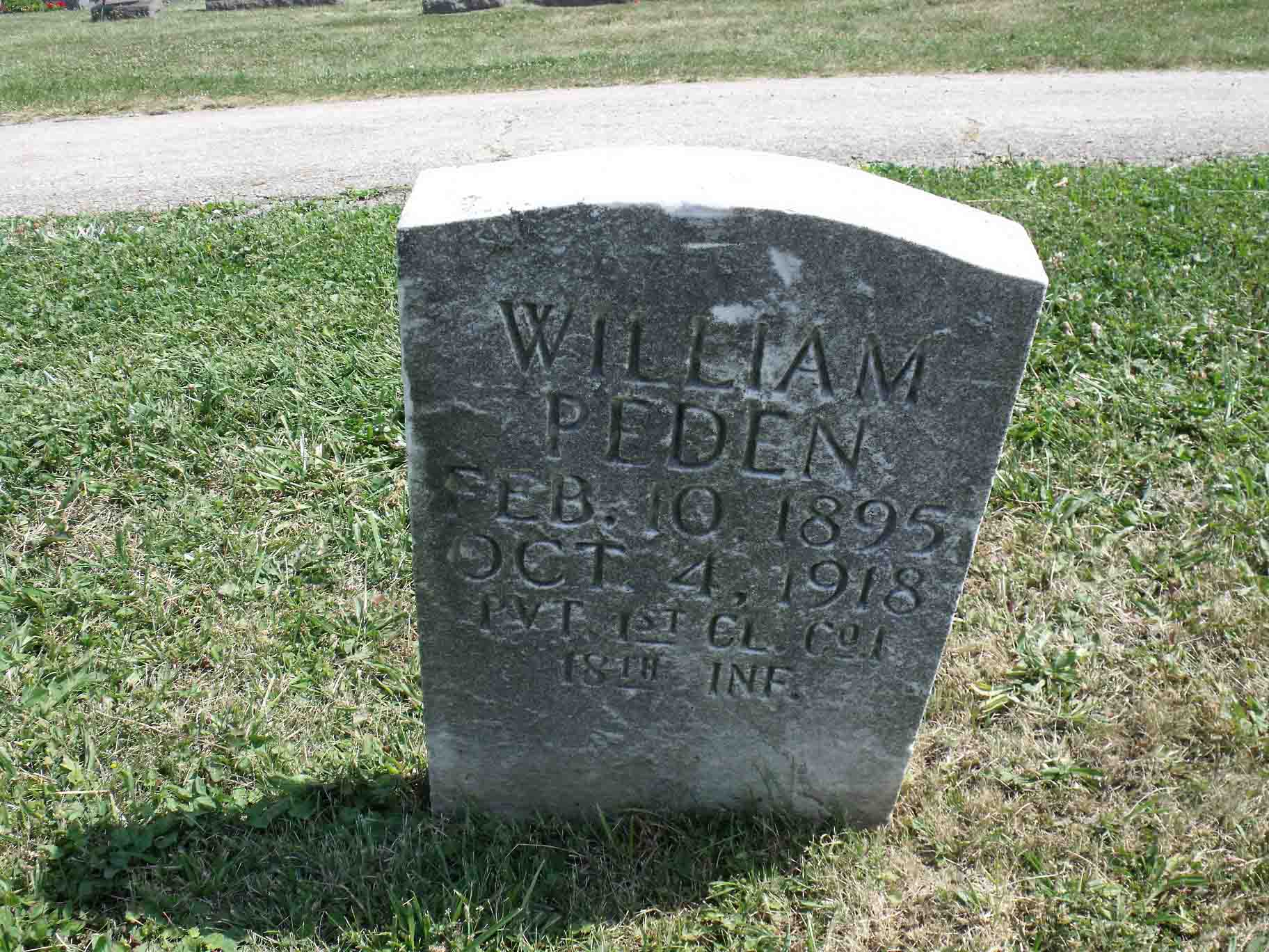 William Peden was born on February 10, 1895 in Westmoreland County, Pennsylvania. He served in the U.S. Army during World War I as a Private First Class in Company I, 18th Infantry Regiment, 1st Infantry Division. He died on October 4, 1918 (at the age of 23) in France and is now buried in Grandview Cemetery, Monessen, Westmoreland County, Pennsylvania, USA.
