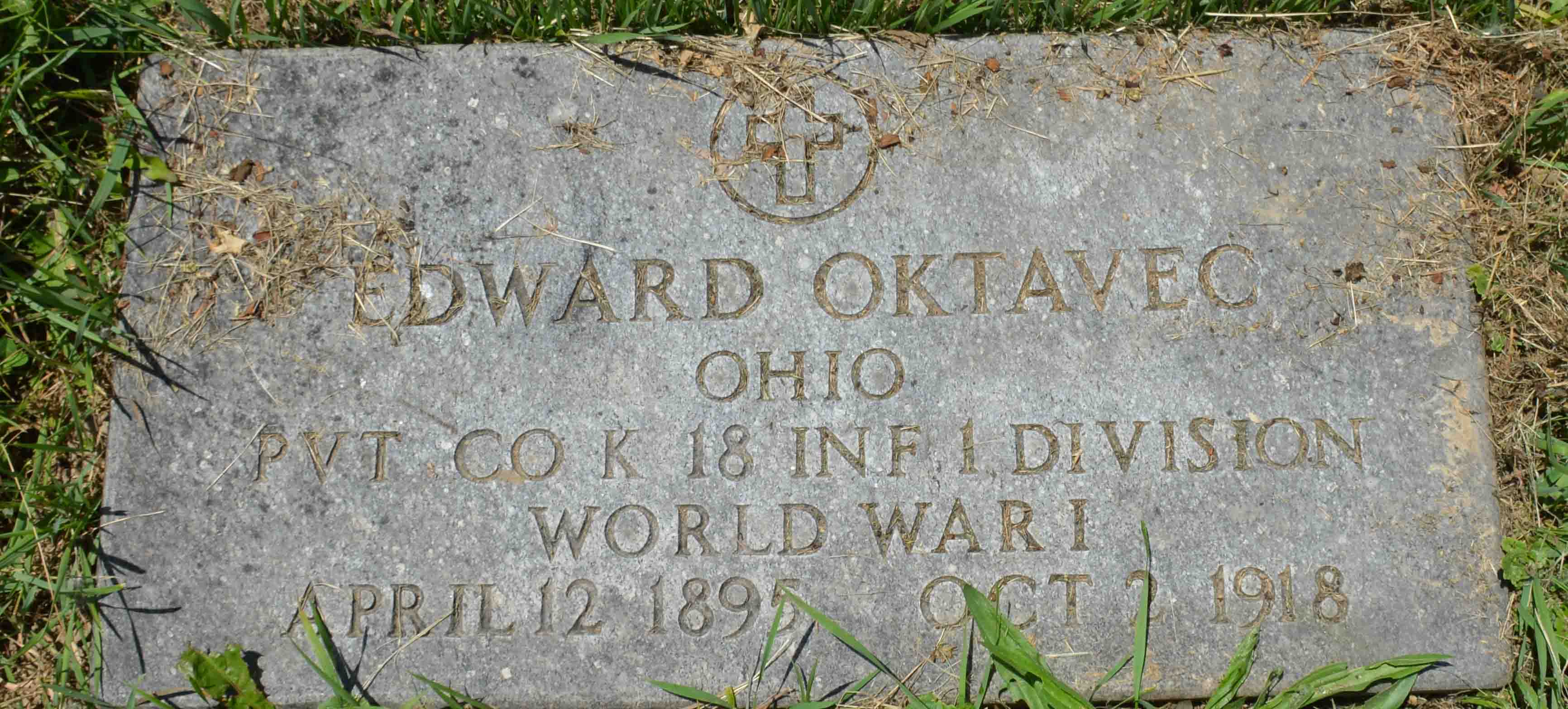 Edward Oktavec was born on April 12, 1895 in Ohio. He enlisted in the Army in April 1918. He served in the U.S. Army during World War I as a Private in Company K, 18th Infantry Regiment, 1st Infantry Division. He was Killed in Action on October 2, 1918 and is now buried in Bedford Cemetery, Bedford, Cuyahoga County, Ohio, USA. His name is commemorated on the First Infantry Division monument in Saint-Juvin, France but his surname is inscribed as Octavec.