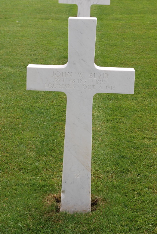 John W. Blair entered the military service in Louisiana. He served in the U.S. Army during World War I as a Private in Company L, 18th Infantry Regiment, 1st Infantry Division. He was Killed in Action on October 4, 1918 and is now buried in Meuse-Argonne American Cemetery and Memorial, Romagne-sous-Montfaucon, Departement de la Meuse, Lorraine, France.