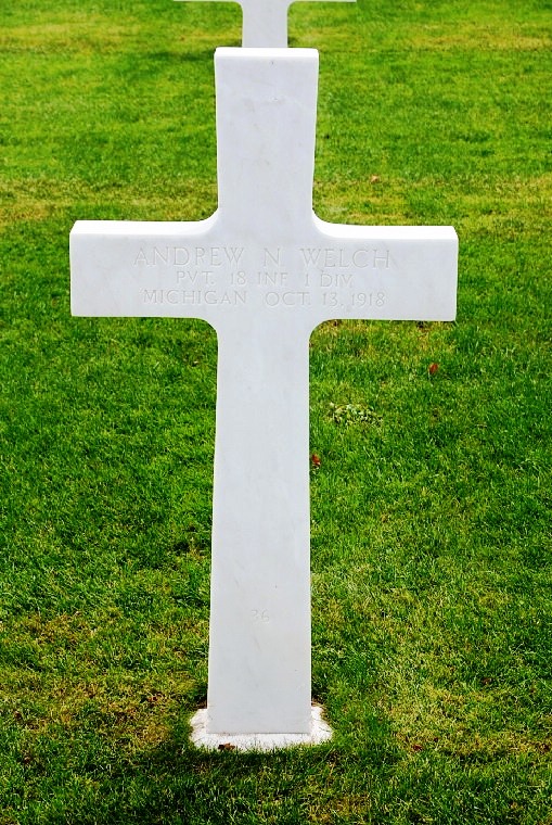 When Andrew N. Welch was born on February 20, 1895, in Central Lake, Michigan, his father, Bela, was 25 and his mother, Rosa, was 24. He had two brothers and two sisters. He served in the U.S. Army during World War I as a Private in Company L, 18th Infantry Regiment, 1st Infantry Division. He died from his wounds received in battle on October 13, 1918 and is now buried in Meuse-Argonne American Cemetery and Memorial, Romagne-sous-Montfaucon, Departement de la Meuse, Lorraine, France. His name is commemorated on the First Infantry Division monument in Saint-Juvin, France but his name's middle initial is inscribed as W.