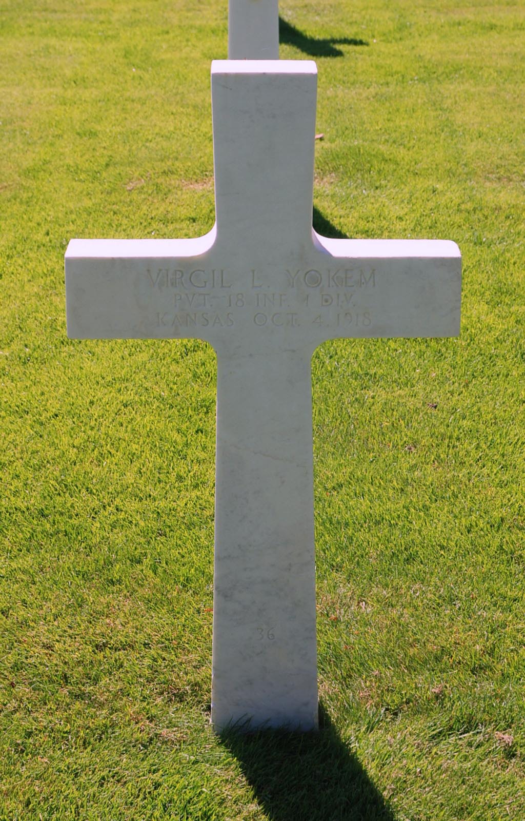 Virgil L. Yokem entered the military service in Kansas. He served in the U.S. Army during World War I as a Private in Company L, 18th Infantry Regiment, 1st Infantry Division. He was Killed in Action on October 4, 1918 and is now buried in Meuse-Argonne American Cemetery and Memorial, Romagne-sous-Montfaucon, Departement de la Meuse, Lorraine, France. His name is commemorated on the First Infantry Division monument in Saint-Juvin, France but his surname is inscribed as Yoken.