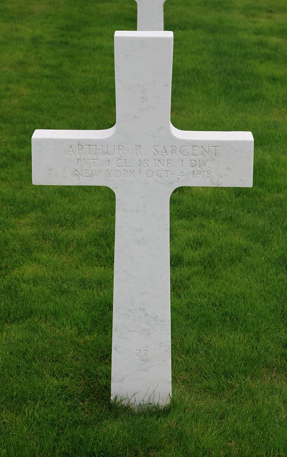 Arthur R. Sargent entered the military service in New York. He served in the U.S. Army during World War I as a Private First Class in Machine Gun Company, 18th Infantry Regiment, 1st Infantry Division. He was Killed in Action on October 4, 1918 and is now buried in Meuse-Argonne American Cemetery and Memorial, Romagne-sous-Montfaucon, Departement de la Meuse, Lorraine, France.
