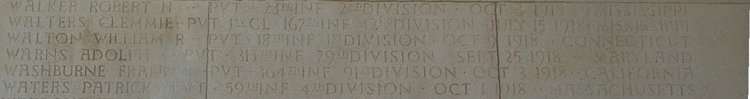 William R. Walton was born in 1894 in Covington, Kenton County, Kentucky. He served in the U.S. Army during World War I as a Private in Machine Gun Company, 18th Infantry Regiment, 1st Infantry Division. He was Killed in Action but declared "Missing" on October 9, 1918 and is memorialized on Tablets of the Missing, Meuse-Argonne American Cemetery and Memorial, Romagne-sous-Montfaucon, Departement de la Meuse, Lorraine, France.