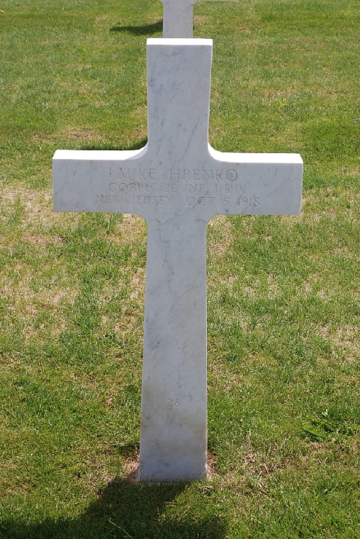 Mike Hrenko entered the military service in New Jersey. He served in the U.S. Army during World War I as a Corporal in Company B, 26th Infantry Regiment, 1st Infantry Division. He was Killed in Action on October 5, 1918 and is now buried in Meuse-Argonne American Cemetery and Memorial, Romagne-sous-Montfaucon, Departement de la Meuse, Lorraine, France.