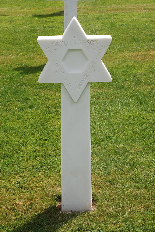 Raoul Gerson entered the military service in New York. He served in the U.S. Army during World War I as a Private in Company B, 26th Infantry Regiment, 1st Infantry Division. He died on October 12, 1918 and is now buried in Meuse-Argonne American Cemetery and Memorial, Romagne-sous-Montfaucon, Departement de la Meuse, Lorraine, France.
