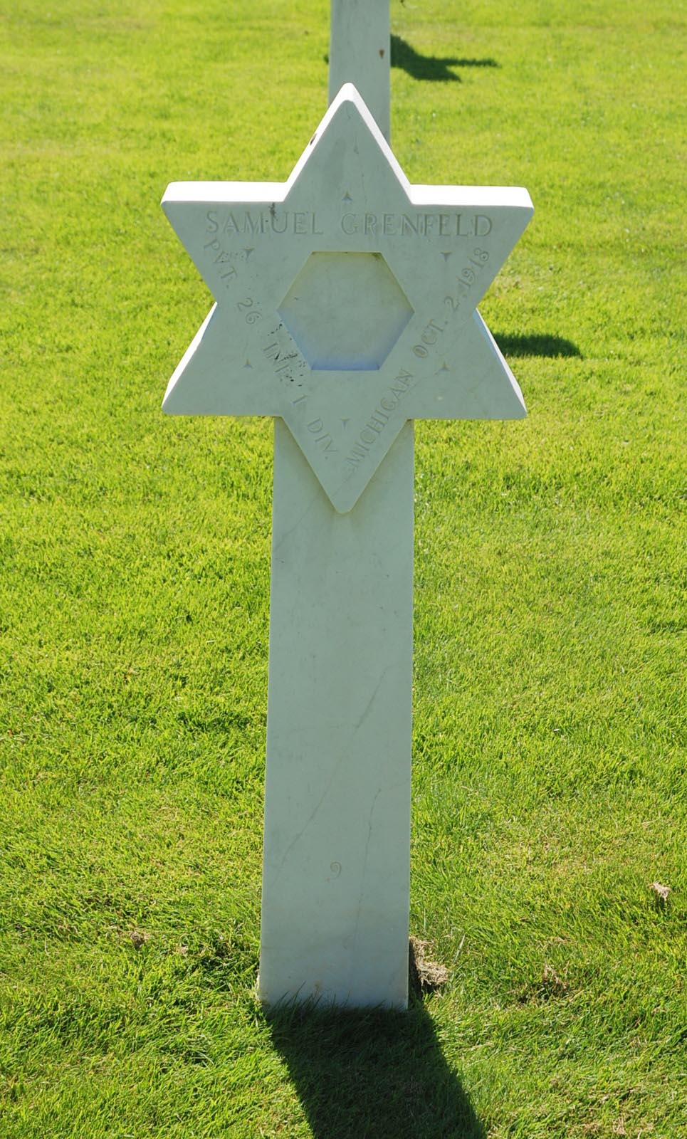 Samuel Grenfeld entered the military service in Michigan. He served in the U.S. Army during World War I as a Private in Company B, 26th Infantry Regiment, 1st Infantry Division. He died from his wounds received in battle on October 2, 1918 and is now buried in Meuse-Argonne American Cemetery and Memorial, Romagne-sous-Montfaucon, Departement de la Meuse, Lorraine, France. His name is commemorated on the First Infantry Division monument in Saint-Juvin, France but his surname is inscribed as Grenfield.