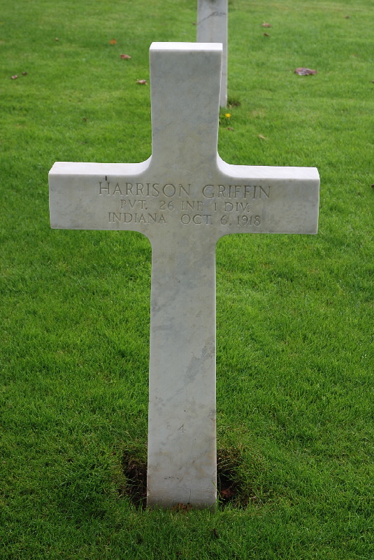 Harrison Griffin was born on December 12, 1878. He was 39 years old when he registered for the World War I draft. He entered the military service in Indiana. He served in the U.S. Army during World War I as a Private in Company B, 26th Infantry Regiment, 1st Infantry Division. He was Killed in Action on October 6, 1918 and is now buried in Meuse-Argonne American Cemetery and Memorial, Romagne-sous-Montfaucon, Departement de la Meuse, Lorraine, France.