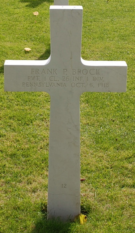 Frank P. Brock entered the military service in Pennsylvania. He served in the U.S. Army during World War I as a Private First Class in Company C, 26th Infantry Regiment, 1st Infantry Division. He died from his wounds received in battle on October 5, 1918 and is now buried in Meuse-Argonne American Cemetery and Memorial, Romagne-sous-Montfaucon, Departement de la Meuse, Lorraine, France.