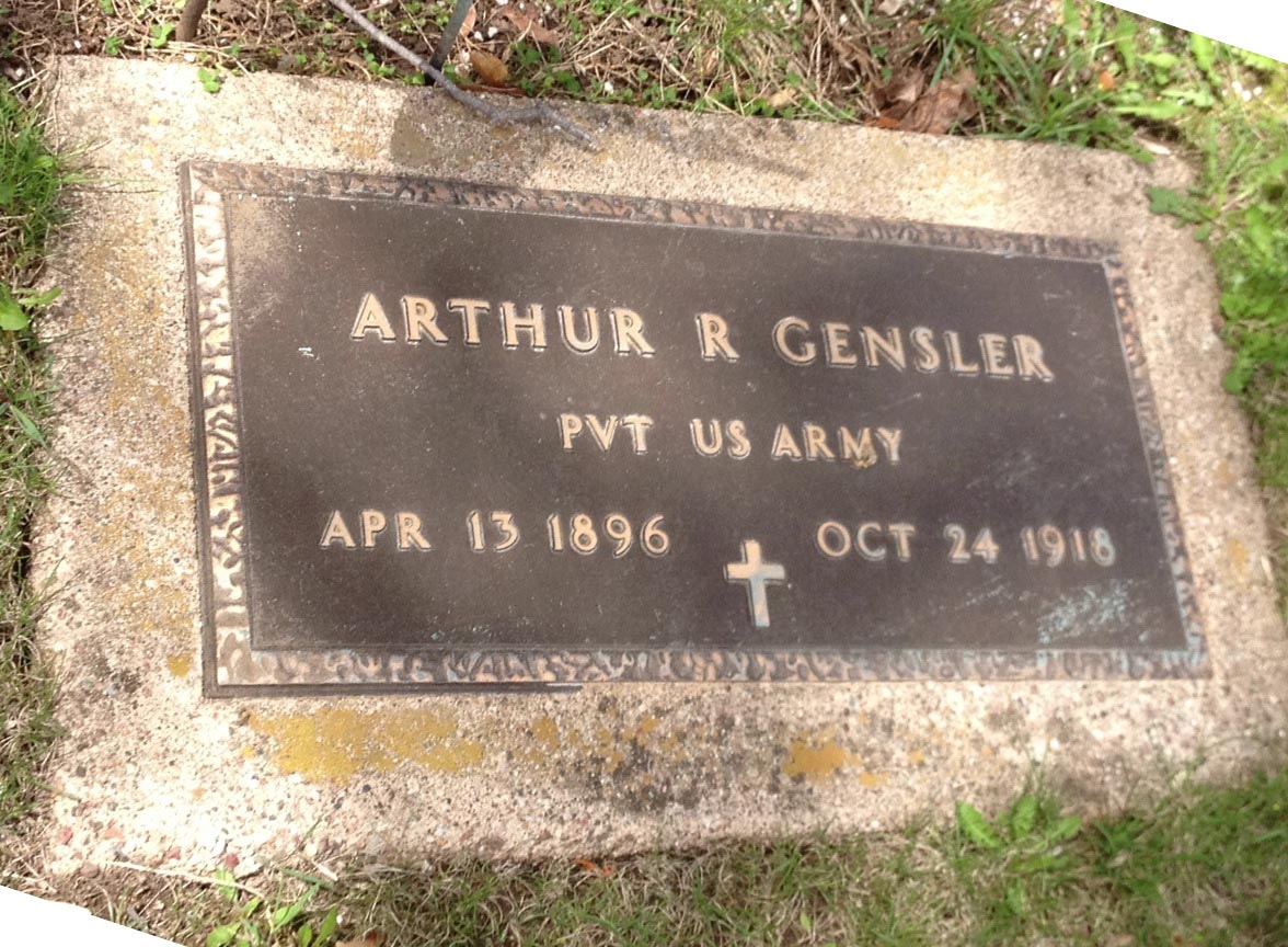 When Arthur Reinhard Gensler was born on April 13, 1896, his father, Frederick, was 28 and his mother, Emilie, was 28. He had three brothers and two sisters. He served in the U.S. Army during World War I as a Private in Company D, 26th Infantry Regiment, 1st Infantry Division. He died from his wounds received in battle on October 24, 1918 in France at the age of 22 and is now buried in Graceland Cemetery, Clintonville, Waupaca County, Wisconsin, USA. His name is commemorated on the First Infantry Division monument in Saint-Juvin, France but his surname is inscribed as Gensber. The Arthur Gensler Post 664 Veterans of Foreign Wars of the United States Auxiliary was mustered in on December 19, 1931. Other records show his name as Arthur Reinhold.
