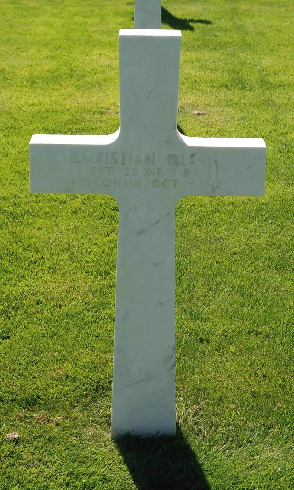 Christian Olson entered the military service in Wisconsin. He served in the U.S. Army during World War I as a Private in Company D, 26th Infantry Regiment, 1st Infantry Division. He was Killed in Action on October 5, 1918 and is now buried in Meuse-Argonne American Cemetery and Memorial, Romagne-sous-Montfaucon, Departement de la Meuse, Lorraine, France.