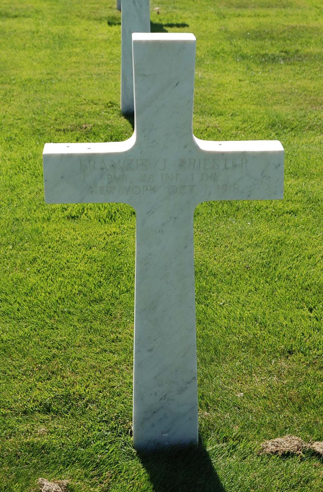 Francis J. Priester entered the military service in New York. He served in the U.S. Army during World War I as a Private in Company D, 26th Infantry Regiment, 1st Infantry Division. He was Killed in Action on October 7, 1918 and is now buried in Meuse-Argonne American Cemetery and Memorial, Romagne-sous-Montfaucon, Departement de la Meuse, Lorraine, France.