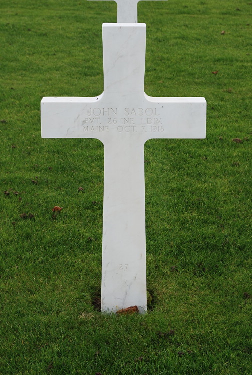 When John Sabol was born on June 21, 1895, in Pennsylvania, his father, John, was 28 and his mother, Anna, was 19. He had five brothers. He entered the military service in Maine and served in the U.S. Army during World War I as a Private in Company D, 26th Infantry Regiment, 1st Infantry Division. He was Killed in Action on October 7, 1918 and is now buried in Meuse-Argonne American Cemetery and Memorial, Romagne-sous-Montfaucon, Departement de la Meuse, Lorraine, France.